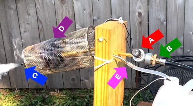 The propane flow is controlled by a valve (A). The fogger is designed to attach directly to a smallish propane tank (B), but this is impacticable for my application, so I have interposed a hose. Note that propane is DANGEROUS in both gas and liquid form. Don't dispense it out of tanks that are upside-down, that's how you get very cold liquid propane in your system. Note also that if your valve (A) is at any distance at all from your tank you're going to have a release of some propane when you unhook everything, so don't do this at all. Disconnect these things only long after everything is cooled down (and ALWAYS disconnect the tank from the hose first, since these small tanks are self-sealing.)
